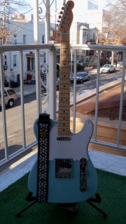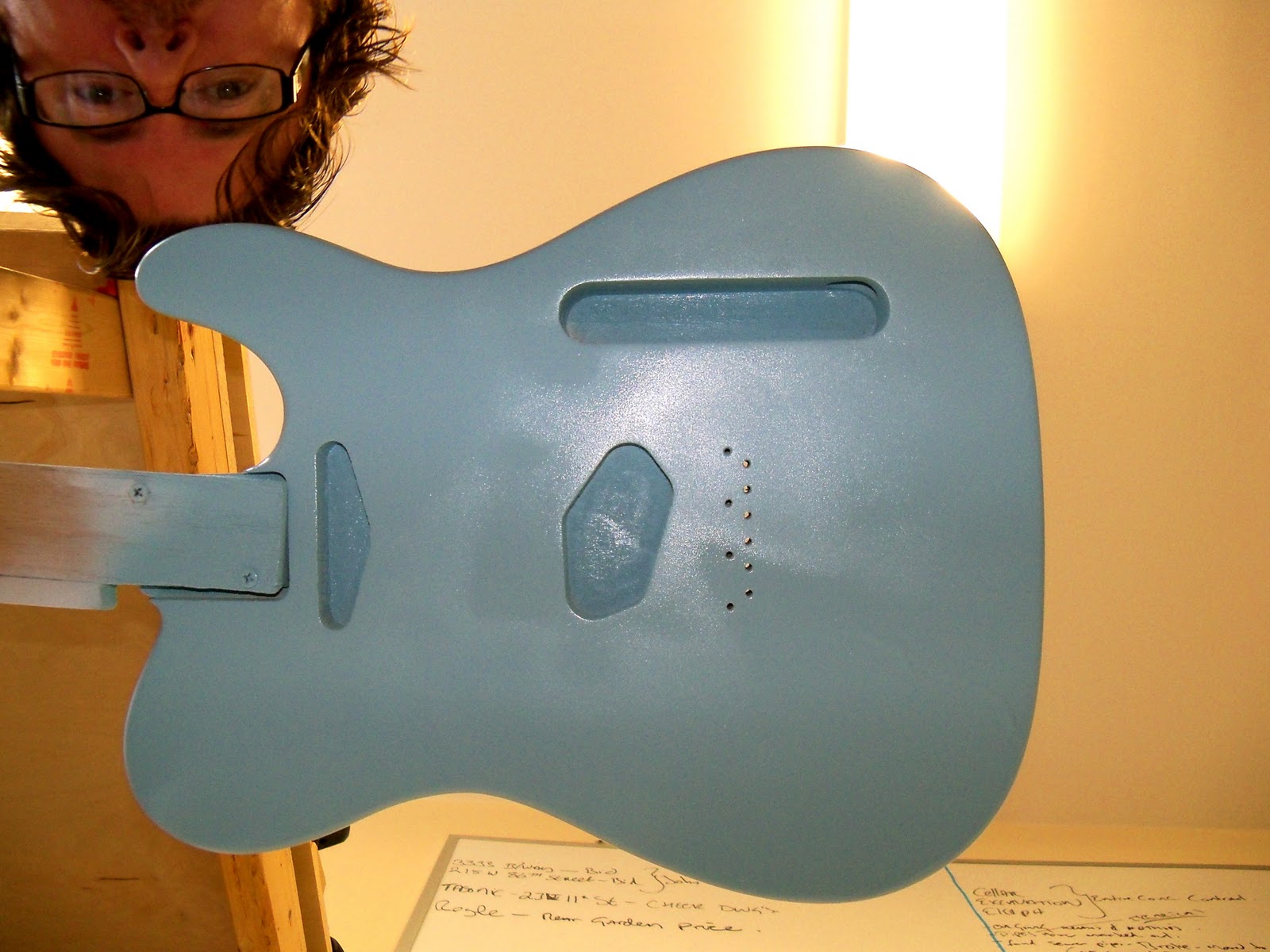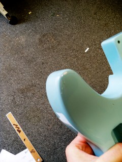 The day arrived when I decided to spray the first color coat. Sonic Blue. I was a little nervous about this to be honest. Again, like the primer before I brought the guitar indoors after spraying. You must always spray outdoors as the fumes are both toxic and quite overpowering. I pretty much repeated the same steps I took with the primer.