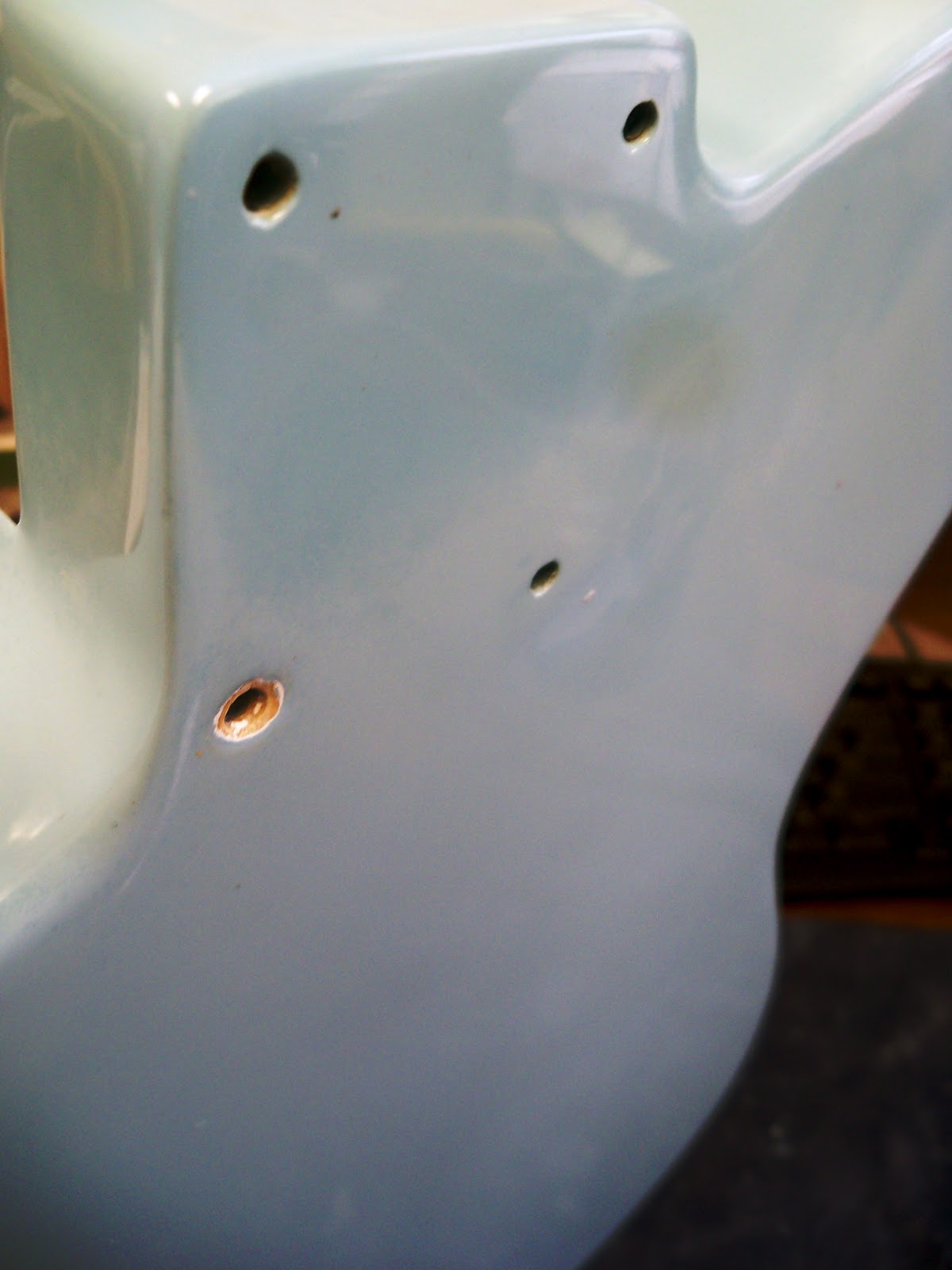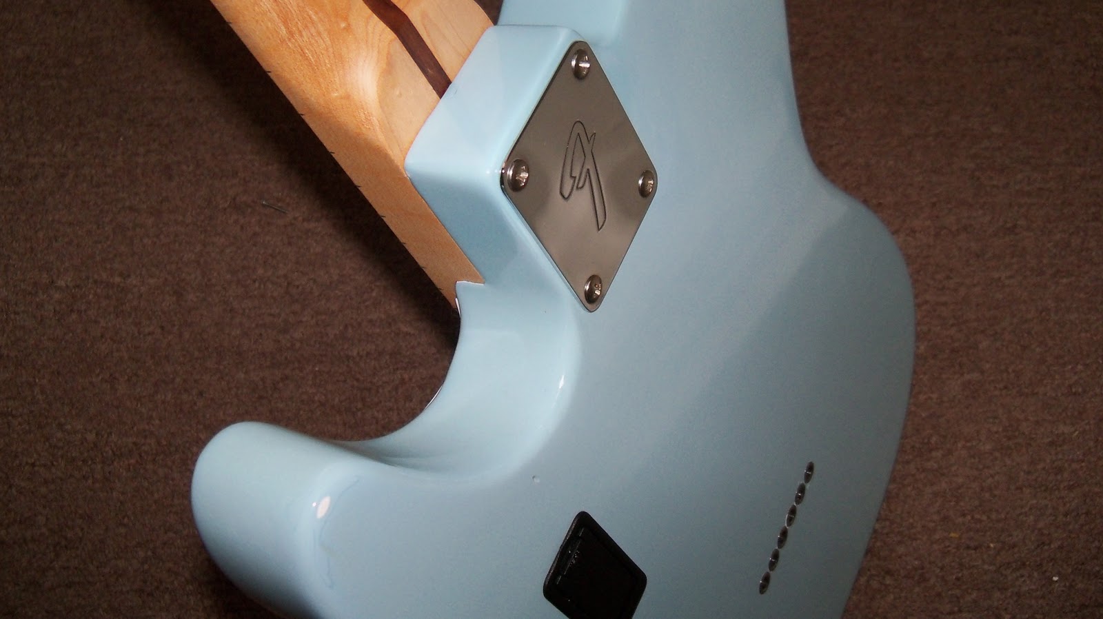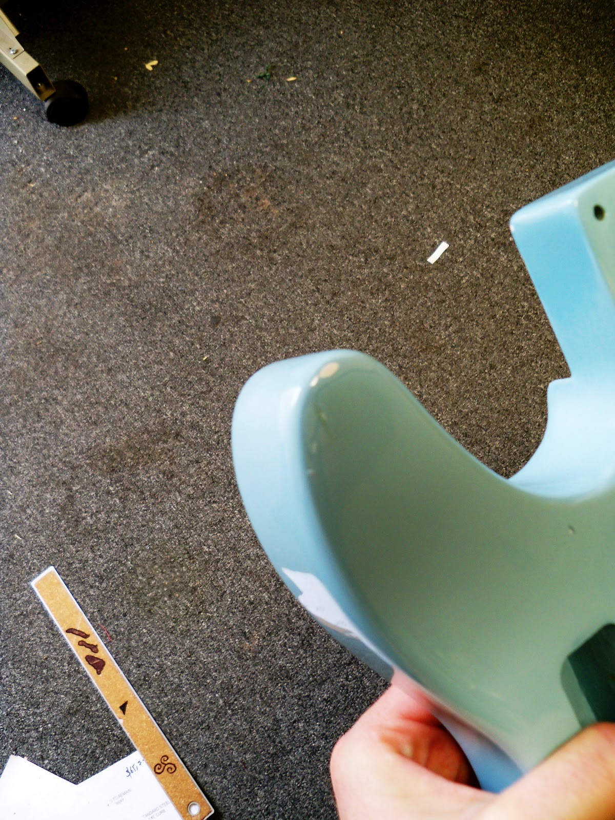 I bought the clear coat spray from Reranch also. The clear coat needs a few days to harden and then will continue to harden up to 60 days later. I applied it in the same manner as the color coat. Spray, leave to dry and wet sand. After almost a week I decided to polish the guitar and begin installing the components. To be honest I found the filling, sealing, priming, painting and sanding process frustrating and was glad to proceed to the next part. The clear coat remained soft and had to be treated carefully when moving the guitar around.