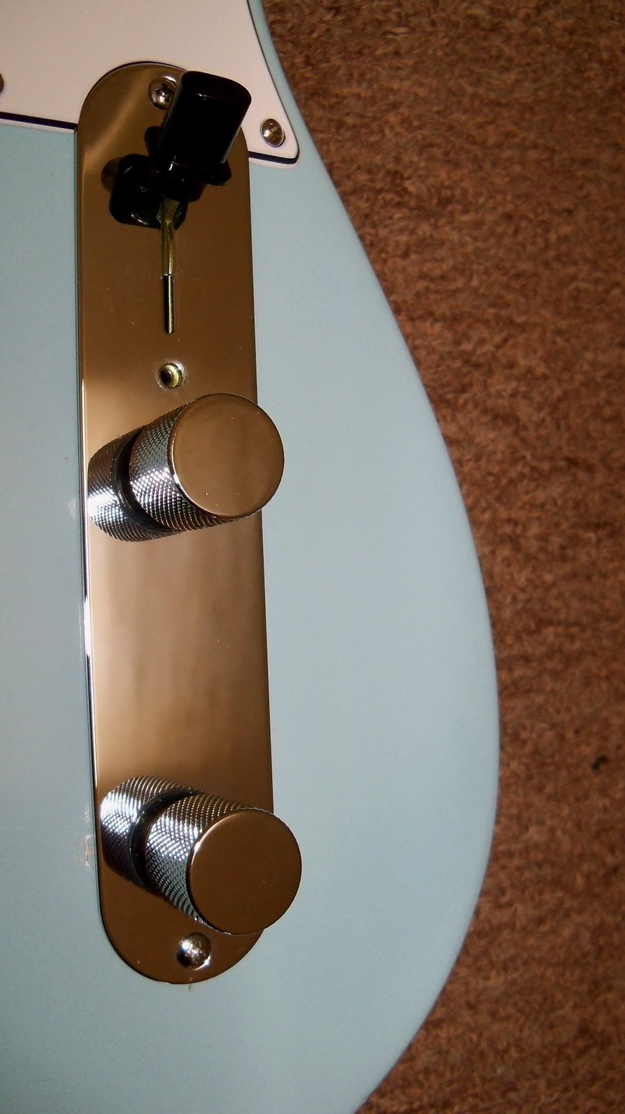 Once I had the pick ups wired and connected to the control plate I drilled and screwed it into the body of the guitar. The volume and tone knobs were attached and we were ready to move on to the bridge plate and pick guard.