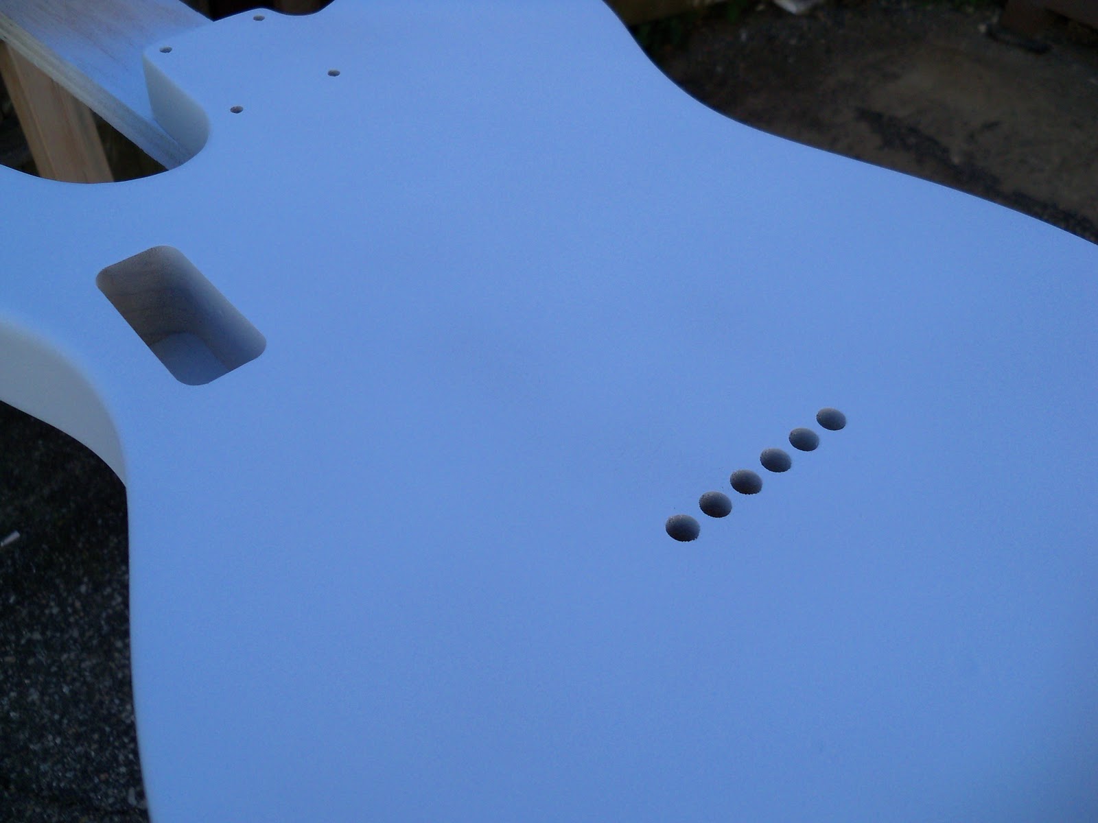 ***Major screw up! I don’t know how I messed this up but I bought small string ferrules and inserted them into the face of the guitar forgetting that on a Telecaster the bridge would provide this function. I realized the mistake when trying to put the bloody bridge on. This is a direct result of my habitual and persistent daydreaming.