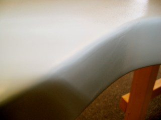 After the sand and sealer had been applied it was time to coat it with primer. I pretty much sprayed it, left it to dry over night, lightly dry sanded it and sprayed it again. I continued until the primer was used up. 5 – 6 coats perhaps. I used a white primer and one can was enough. It dried to a matte finish. More on this later.
