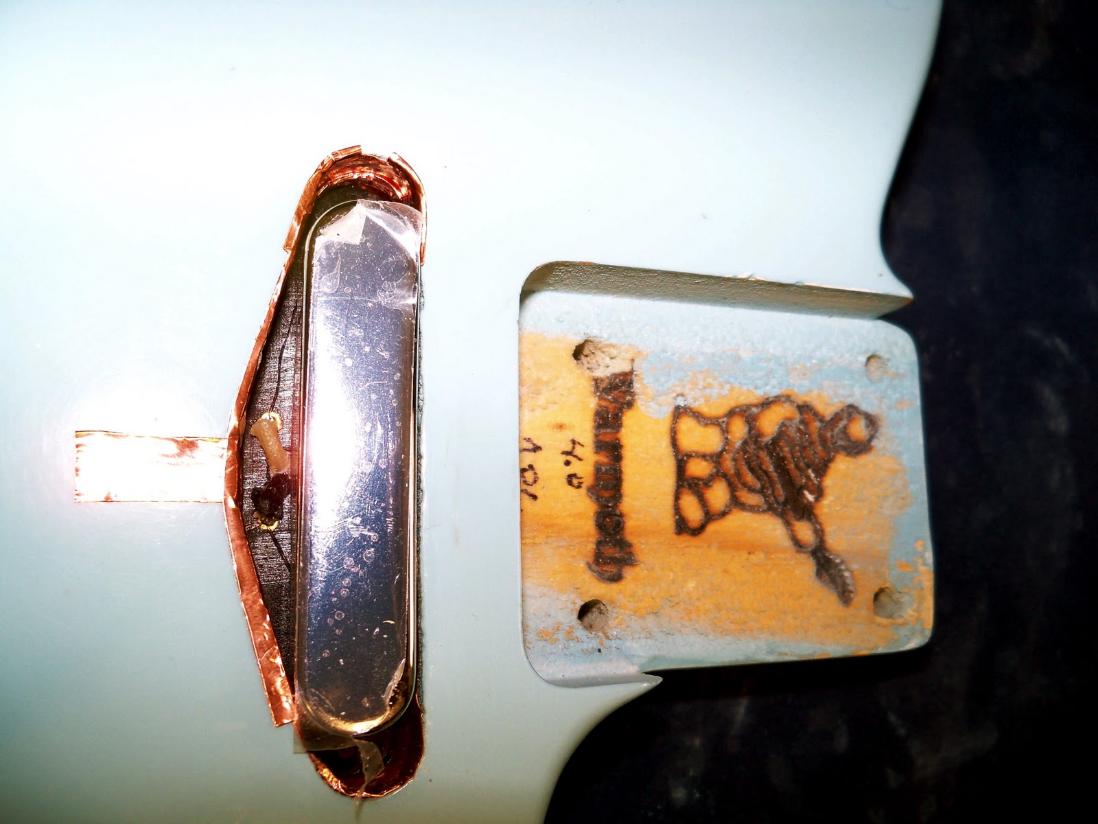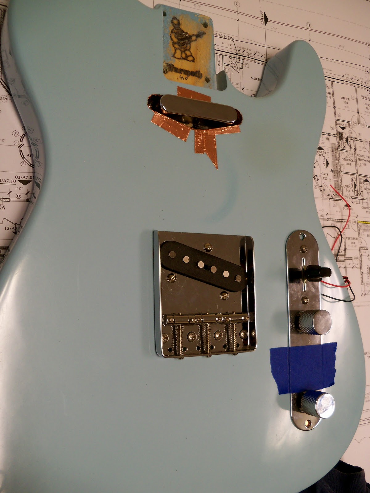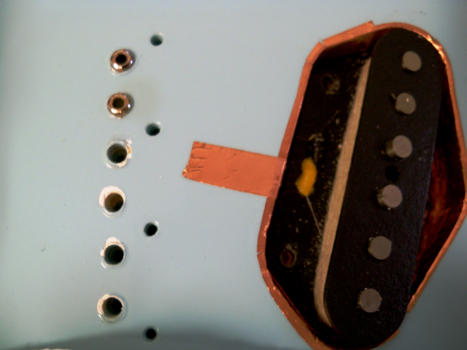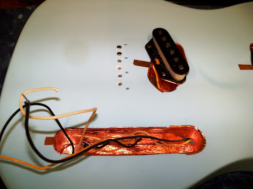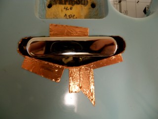 The neck pick up can be seen here along with the copper tape. The neck was the only area I did not prime or paint. I did fill the grain to prevent any water penetration.
