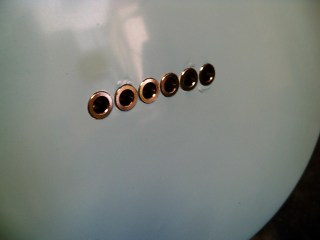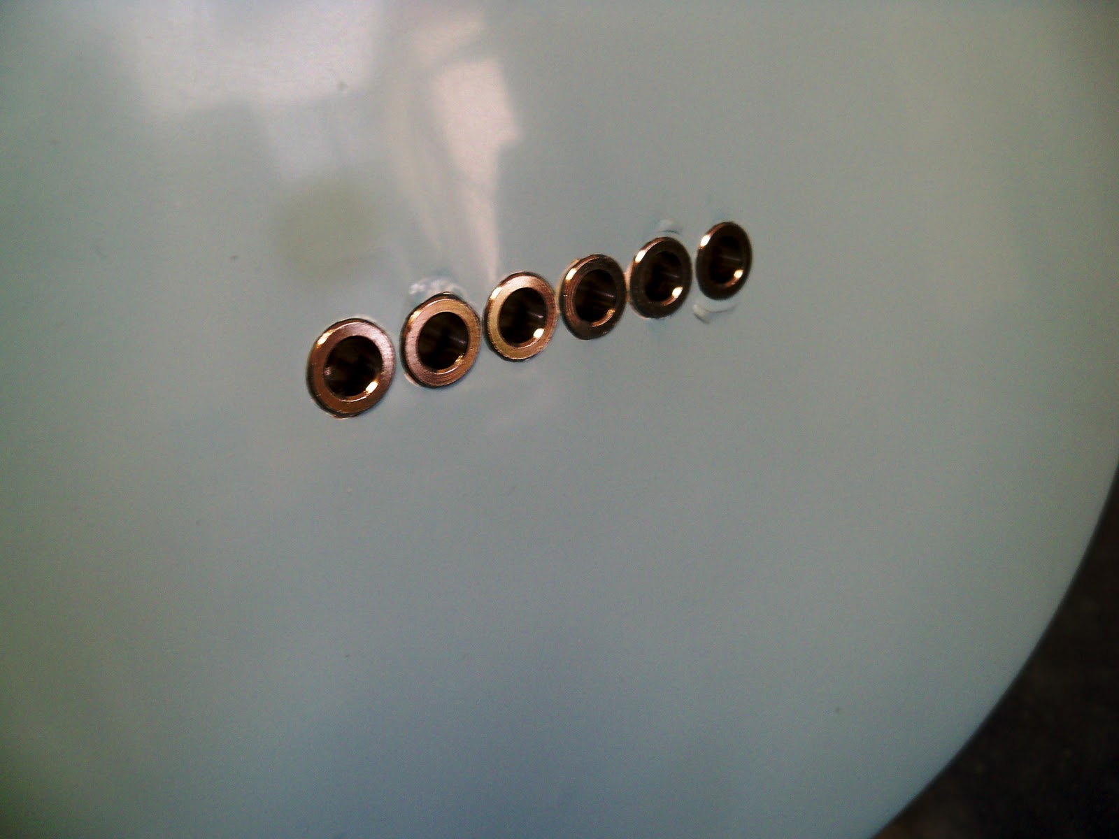 At the back I installed the ferrules for the strings. As can be seen I damaged the paint . The ferrules are to be driven in and in my enthusiasm I was not as careful as I should have been. The one that did not damage the paint was the one I heated with the solder iron and installed while hot. The paint became pliable and soft and did not crack. The paint then cools and reforms around the ferrule. I recommend you take this approach.