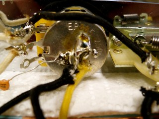 Connecting the earth to the back of the volume pot was difficult. I found the best way was to place a dab of solder on the pot first and let dry. Then I held the wire to it and reheated it with the solder iron. The solder became liquid, the wire melted into it and when I took the iron away it all fused nicely together.