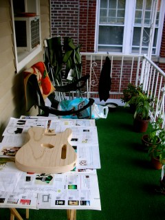 Some of the early stages I could do at my apartment. I prepared the balcony for some grain filing. I quickly learned that the work involved in getting the body ready was the hardest. I laid down some papers on an old table and got to work. It was a beautiful spring day. The neighbors often see me singing and playing the guitar on the balcony most nights. To now watch me build a guitar must have looked like I was travelling back in time.