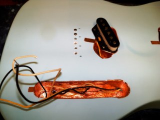 It was recommended that I cover the pickup cavities with copper foil. I bought DiMarzio Copper Shielding Tape, 24″ x 3-1/2″ from amazon.com and a single roll was just about enough. I would buy two to be sure. I covered all three cavities which is trickier than you would expect and also the back of the scratch guard to entirely encase the electronics in a copper shield. I left a narrow strip of copper to extend out onto the face of the guitar so it would connect to the copper tape at the back of the scratch guard. This whole process was done as to avoid external electrical interference with the guitar’s electronics.